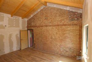 The ground floor consists of a central entrance with a staircase made from original Lucerna stone. On this level you find a cosy and larger than normal kitchen / dining room with access to a small but modern bathroom. Also, on the ground floor you find a lovely living room (currently used as a bedroom). Throughout the ground floor you have the beautiful red vaulted brick ceilings.