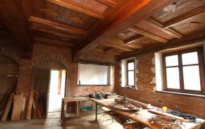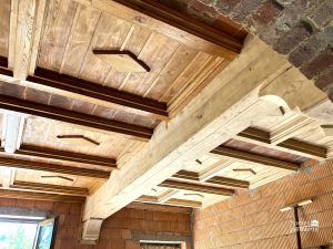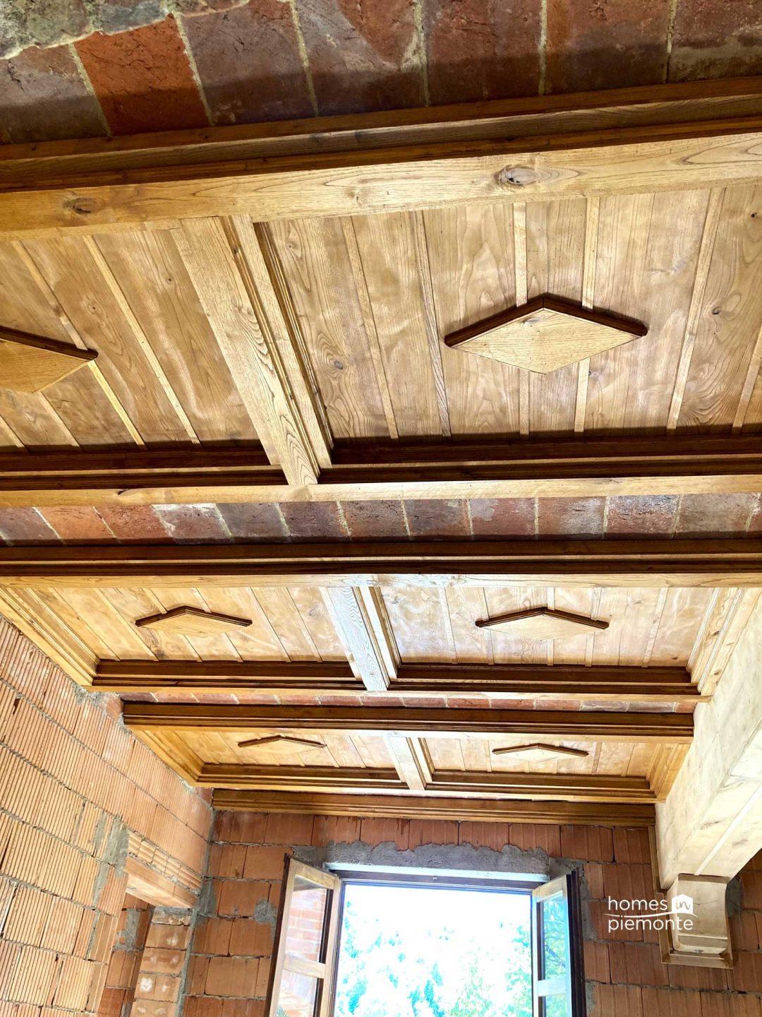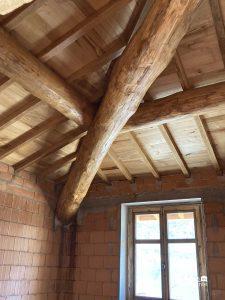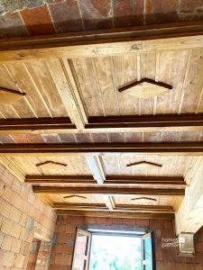 Internally, the structure celebrates a fine balance between modern design in an authentic farmhouse setting. The roof is a striking architectural feature with its visible roof construction made from very large, specially imported French Castagno timber, providing a spectacular, rustic-luxury aesthetic to the upper floor. On the ground floor, many ceilings feature hand-carved Castagno wood panels and classic wooden ceiling beams, while the first floor combines the Castagno beams with traditional terracotta tiles.